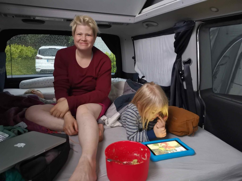 Ein verregneter Morgen und was macht man da am besten? Rumgammeln, Frühstück im Bett, Video gucken… Mittags wurde das Wetter schon wieder freundlicher, da kam ich schon beim schnellen Paket holen aus dem „Städtchen“ ins schwitzen. Hat sich aber gelohnt unsere 2 neuen Falteimer haben sich sofort bewährt als neues Abwasserschätzchen und Waschschüssel. Joshi hat sich einen Karabiner aus dem Paket stibitzt. Danke an „unterwegs.biz” für den schnellen Versand. 🙂