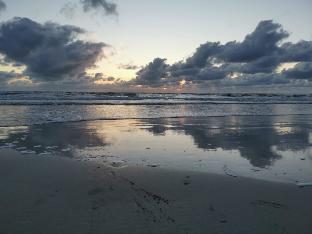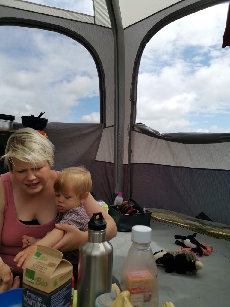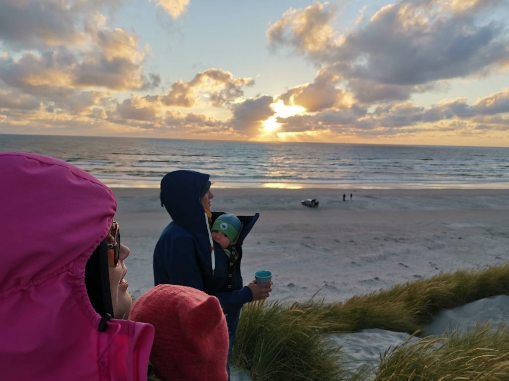 Abends verabredeten wir uns mit Thomas und seiner Familie, um zu bezeugen, wie die Sonne in die Nordsee eintaucht. Natürlich mit Getränken bewaffnet. Die Jüngsten, Janne und Josh, waren jeweils bei Mama in der Trage.