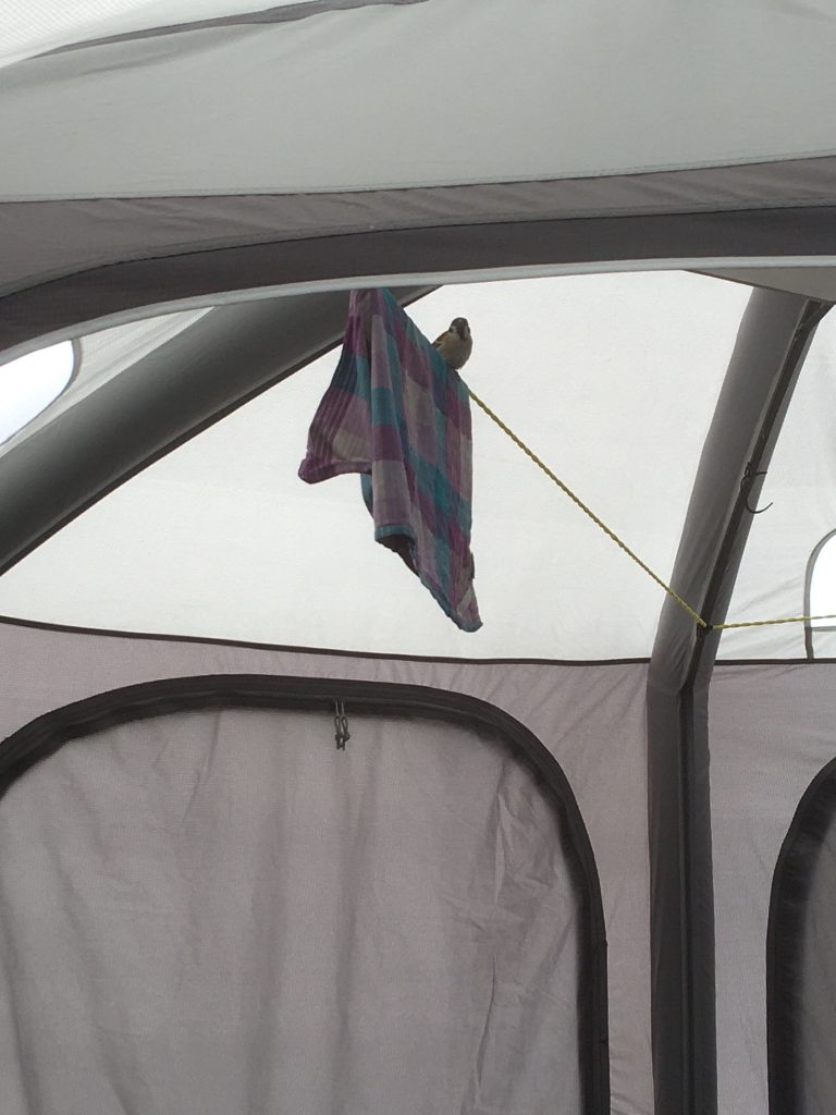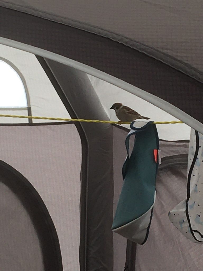 Eine Sache empfand ich komisch in diesem Urlaub. In regelmäßigen Abständen überschlugen sich Marie und Ina mit “Da ist ein Vogel in unserem Zelt!”. Dann schaute ich nach und es war kein Vogel im Zelt. Ina beteuerte dann, dass da wirklich ein Vogel gewesen war, aber wo sie im Wissen blieb, blieb ich im Glauben. Dann endlich passierte es: Marie und Ina riefen: “Da ist ein Vogel in unserem Zelt!”, ich schaute nach und siehe da: Da war ein Vogel in unserem Zelt! Es war ein kleiner Haussperling, also ein Spatz.